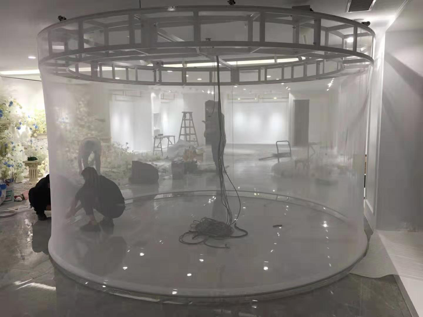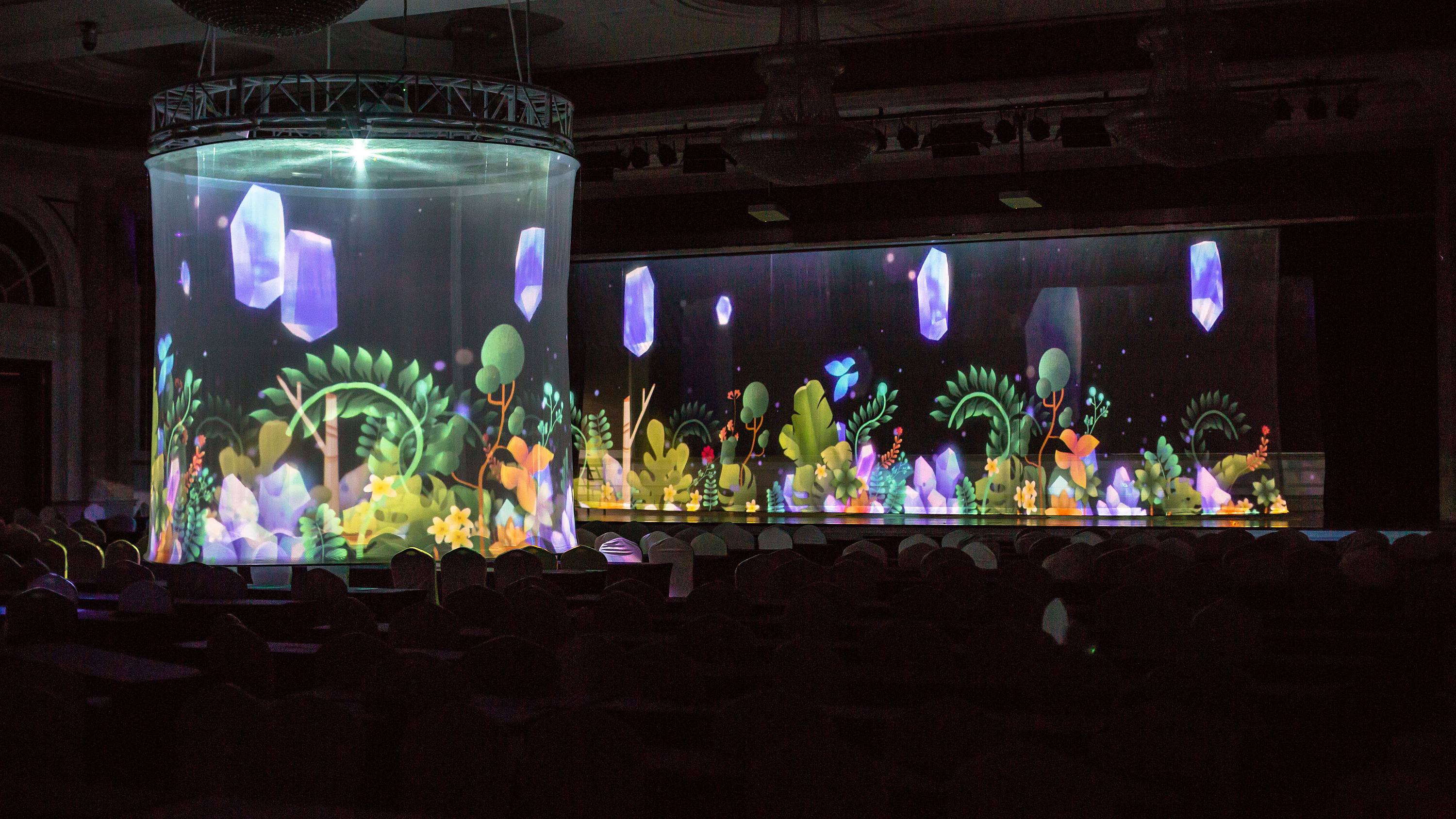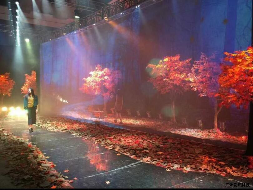 全息纱幕是网纱材质的幕布,它的成像介质即如轻纱般的薄幕,它可以是极为纤细的铁丝网、钢丝网,也可以是不易被肉眼所见的纱布。通过投影机将动态视频投射到大型纱幕上,配够浮现出梦幻绚丽的画面。在纱幕投影的实际使用过程,投影机角度也能给大家带来不一样的视觉效果。从前面向纱幕投光可以表现渲染纱画幕上所画的形象;从纱幕背面向纱幕投光时,纱幕前面所画的形象看起来则不复存在,更易于表现虚拟、朦胧的幻觉空间效果。