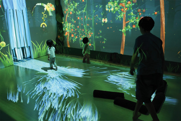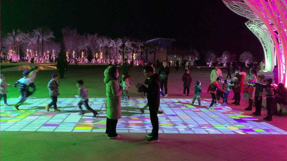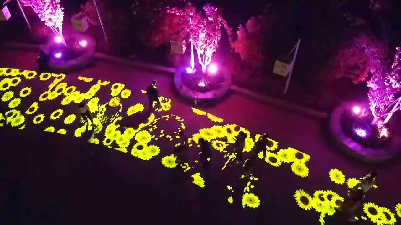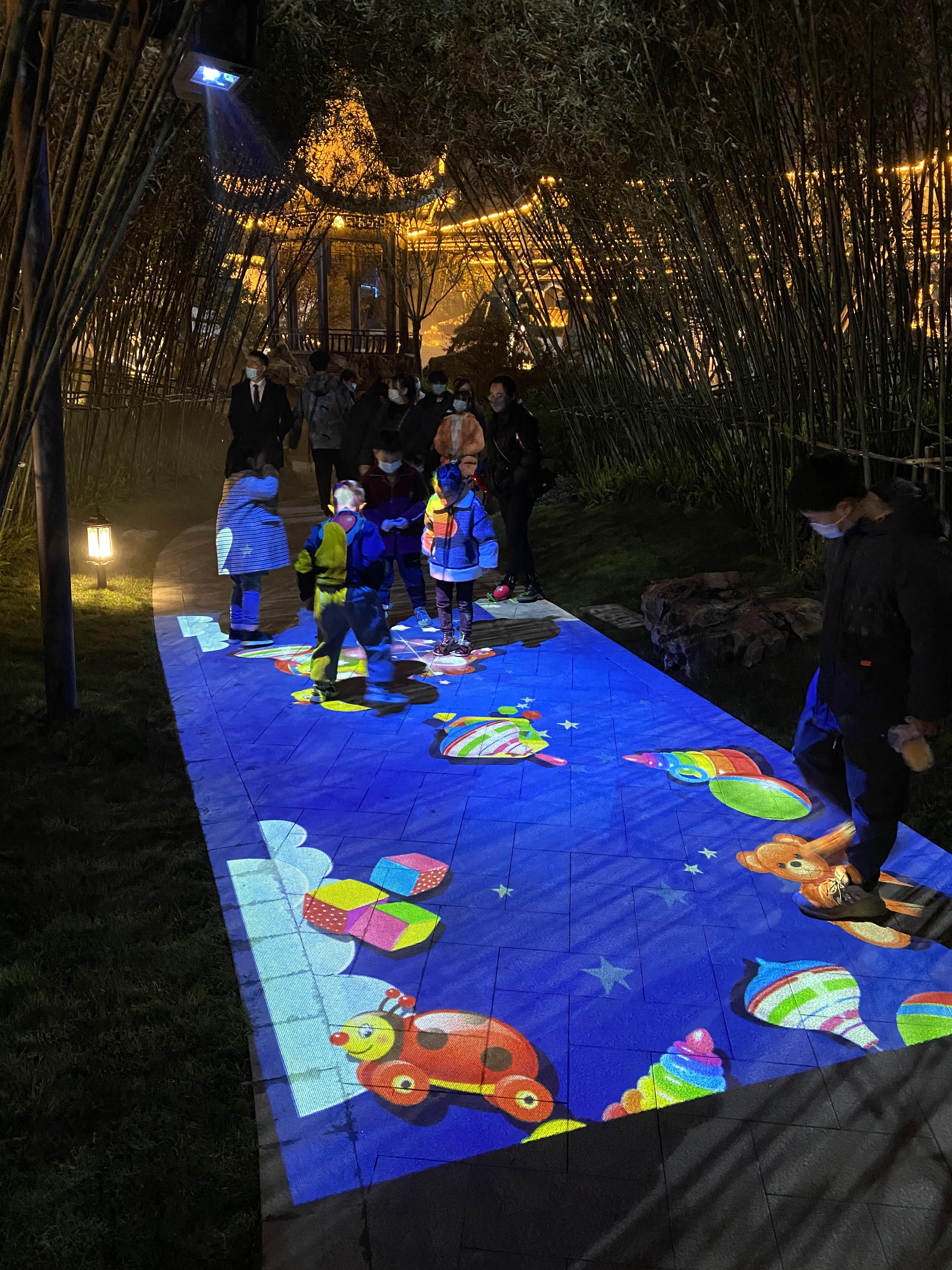 因为互动系统是集虚拟仿真技术、图像识别技术于一体的互动投影项目,所以参与者可通过身体动作与地面图像进行互动,以水波纹、避让、跟随等形式互动内容展现。