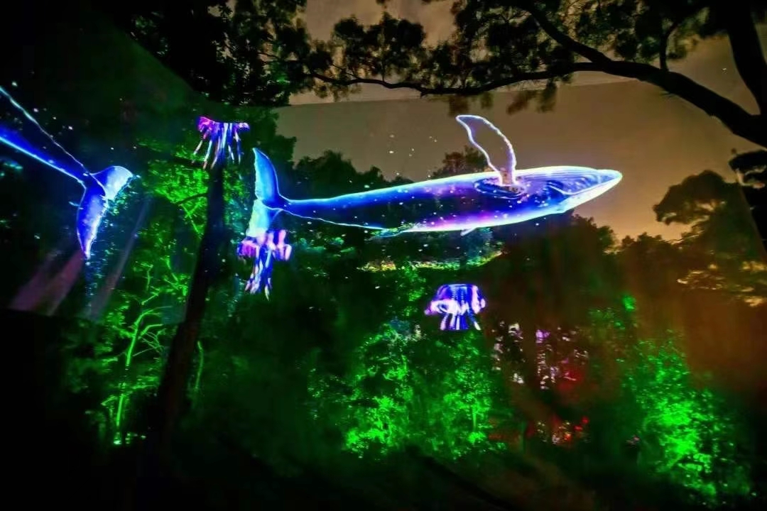 全息互动投影系统可以提供多种信息包 括人们所想或所需的各种画面和图案,以其独特的方式来表达的新型的广告形式,同时还打破了传统静态广告毫无娱乐性的传统悬挂风格。