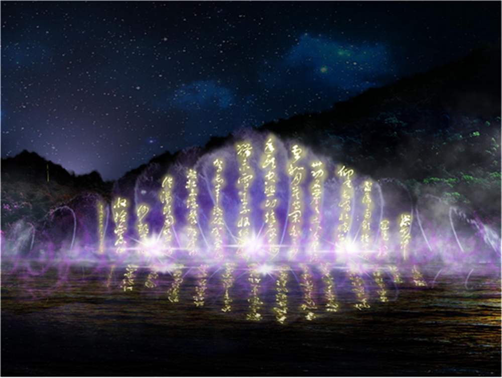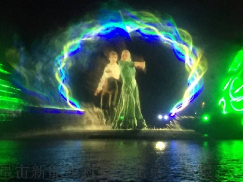 水幕电影是通过高压水泵和特制水幕发生器,将水自下而上,高速喷出,雾化后形成扇形“银幕”,由专用放映机将特制的录影带投射在“银幕”上,形成水幕电影。当观众在观摩电影时,扇形水幕与自然夜空融为一体,当人物出入画面时,好似人物腾起飞向天空或自天而降,产生一种虚无缥缈和梦幻的感觉,令人神往。